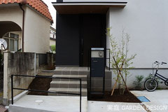 モノトーンで統一された玄関周りに、シンボルツリーが加わることにより、完成度が上がります。