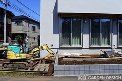 建物が完成して、外構工事の開始です。長雨の時期と重なり、なかなか始めることができない中、晴れ間を見計らって工事を進めます。